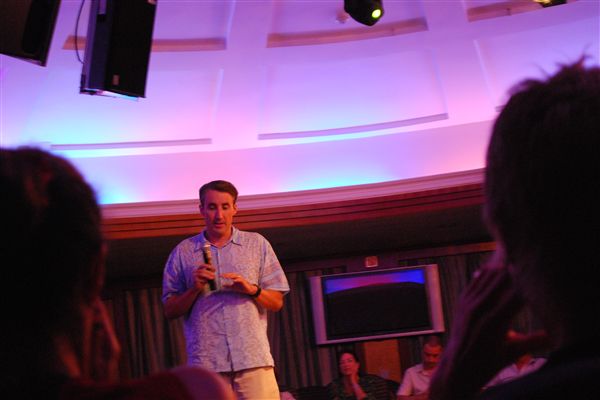 节目单上几乎每晚都说休息室有卡拉OK,但我一次也没看到有人唱,也不知道该怎么开始。或许应该找个工作人员先唱几句,把气氛拉开。