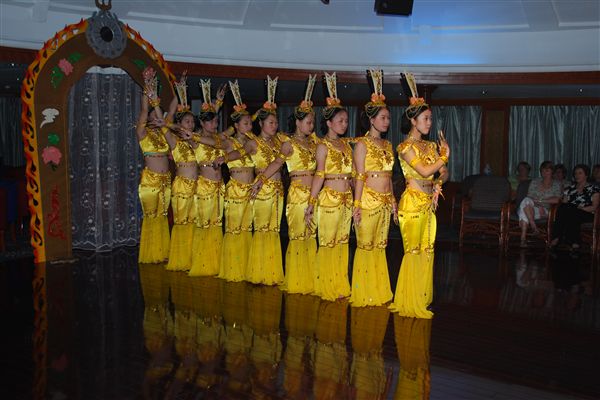 第五天是唯一一天完全在河上。如果你顺流而下,这趟游轮会安排七天,省去这一天。和前一天一样,船上通常会安排一些活动。如果你对这些不感兴趣,船上有一个美容院/按摩院、一个小型健身房、一个带酒吧的大型休息室和四台网速极慢的电脑,大厅里有一些购物场所,船顶上还有很多公共座位。晚上的娱乐活动是“少数民族秀”,其中有很多非汉族的服饰。