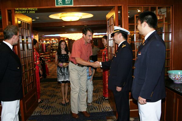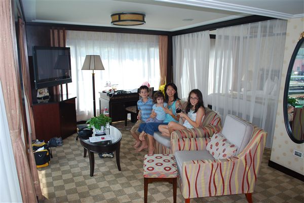 短途和长途游轮都只开往一个方向。我们于2009年7月26日在上海登船。虽然登船时间应该在下午3点开始,但考虑到我们提前大约一个小时到达,船员们还是很乐意让我们登船。身着贡多拉船夫服装的员工热情地迎接了我们,并把行李直接送到了房间。登船后,我们被告知可以升级房间。我觉得价格合理,所以我们升级了两个舱房中的一间。这间是女孩子的房间,我妻子和两个女儿住,我和儿子则住在小舱房。白天的时候,大套房足够我们所有人住。所有舱房都带阳台。舱房的大小与大型游轮上的舱房相当。