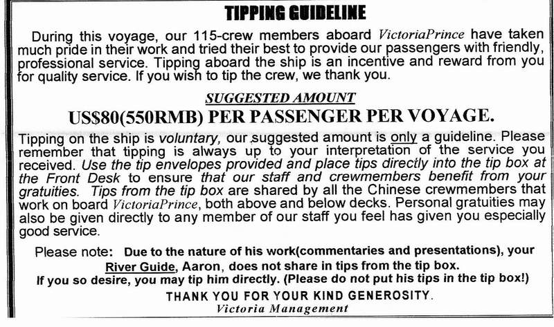 第八天是丰都节。根据中国传说,丰都人死后必须经过的地方,在那里接受审判,然后才能开始下一世,下地狱,或者其他任何后续事件。它有点像中国版的炼狱。如果这就是你死后要去的地方,那上帝真是个愤怒而又报复心强的神。他们带我们去的地方是一座风景优美的山,至少在我看来,它已经被改造成了一个旅游陷阱。首先映入眼帘的是一排长长的纪念品摊位,每个摊位都卖着同样的东西,大多数摊位上都会有人在你走过时大声打招呼。然后,你可以选择乘坐滑雪缆车或爬楼梯到达山顶。我当然选择了爬楼梯。在家乡,人们会花大价钱去爬无聊的楼梯机。山顶挤满了游客,空间狭小。据说地狱有三个考验,但在拥挤的人群中,我们弄丢了导游,只找到了其中一个考验。测试要求你在一块圆石上保持平衡三秒钟。如果你能完成,就说明你前世品德高尚。三秒钟很容易就能完成;大约90%的人都成功了,包括我。如果这才是真正的考验,那上帝也太不挑剔了。平心而论,我对丰都号的评价很差,因为那天下着倾盆大雨,我还得拖着一个三岁的孩子,这或许也是我如此疲惫的原因之一。那天晚上是船长的告别宴会,我们在那里被告知了“小费指南”。我会把放在我们船舱里的说明复制粘贴到下面。