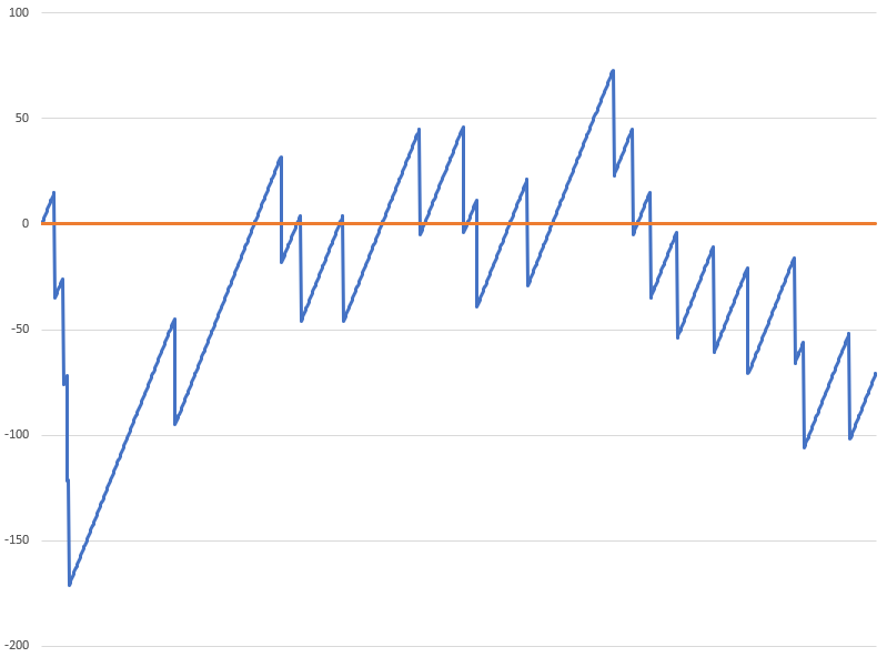 第一个模拟基于百家乐中的闲家投注。模拟规模超过 730 亿次。提醒一下,闲家投注的理论庄家优势为 1.235%。
