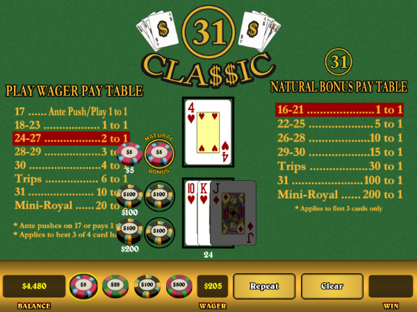 在上面这手牌中,我前三张牌之后,红桃点数为20,所以我下了“玩牌”的赌注。抽牌是红桃4,红桃点数总计24。由于总点数为24,我的“底注”赔率为1比1,而“玩牌”的赔率为2比1。“自然31奖励”的赔率基于我最初的三张牌,总点数为20,赔率为1比1。