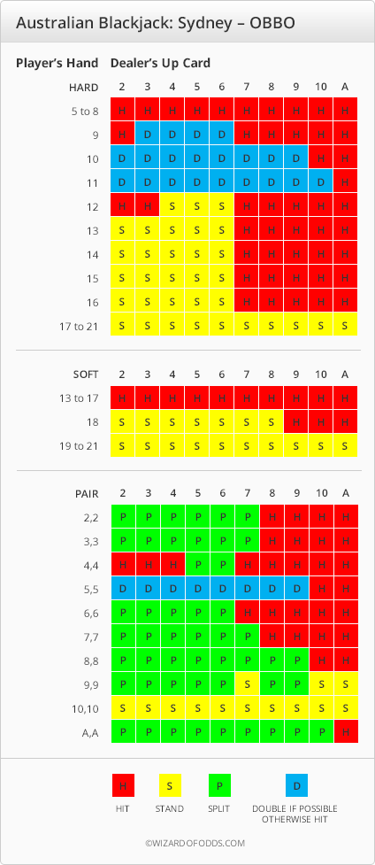下表适用于OBBO规则,庄家在软17点停牌。相对于上面的BB+1策略只有两处变化:打出8,8对10,以及打出A,A对A。