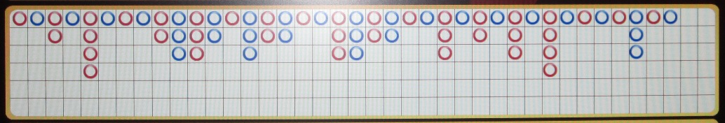 - 如果该牌型在大路中形成新的一列,则比较大路中之前的两列。如果它们的深度相同,则在大眼仔中记录一个红色圆圈。如果不同,则记录一个蓝色圆圈。