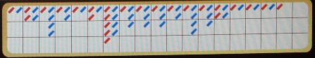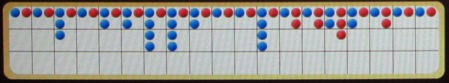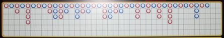 到了下一张牌桌,事情的走向就不那么明显了,这时我开始需要帮助了。如前所述,百家乐玩家非常迷信。虽然他们用来寻找规律的策略可能很复杂,但一个基本事实是,他们喜欢可预测性和重复的模式。例如,如果前12手牌是BBBPPPBBBPPP,我敢打赌,下一手牌桌上的每个人都会押庄家赢。注意,赢家是三人一组的。大眼仔牌桌有助于衡量牌靴的重复性。红色表示重复,蓝色表示混乱、“不稳定”。需要注意的是,在大眼仔牌桌中,蓝色和红色与闲家和庄家的赢家无关,这与前两张牌桌不同。