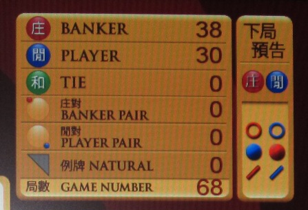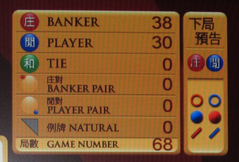 最后,上图显示的是显示屏的右上部分。左侧部分显示的是牌靴整体的统计数据,即每种下注的获胜频率。这并非一个非常现实的例子,因为为了举例说明,我只加入了闲家和庄家的获胜情况。右侧部分显示的是大眼仔、小路和蟑螂猪的下一手牌是闲家获胜还是庄家获胜,将会发生什么情况。