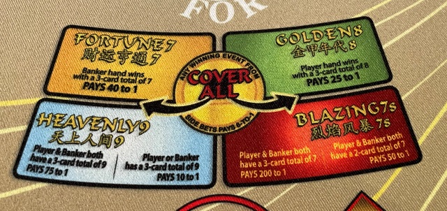 - 天上九点 — 如果玩家或庄家的三张牌总数为 9,则赢。如果双方都为 9,则赔率为 75 比 1;如果其中一方为 9,则赔率为 10 比 1。