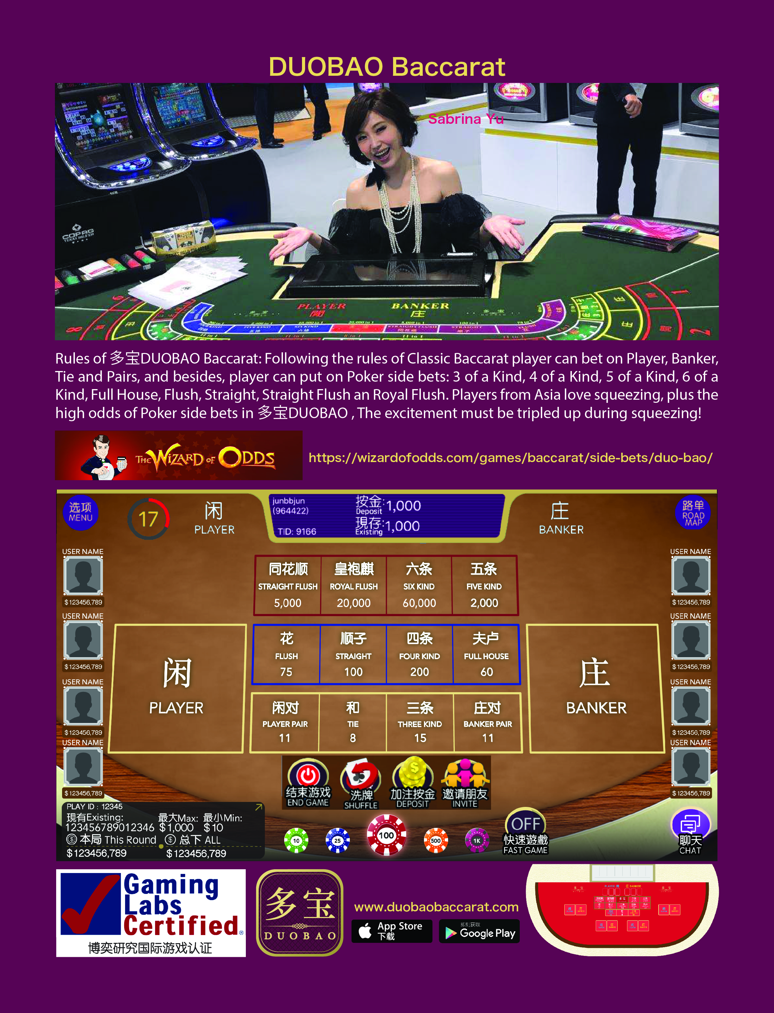 如果我的中文没错的话,“多宝”的意思是“许多宝藏”。这是一款百家乐游戏,包含多种基于扑克牌的边注。由于百家乐规则与传统百家乐相同,我将把这款游戏归类为百家乐边注合集。