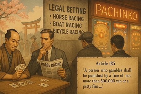 日本对赌博的法律规定非常严格。 《刑法》几乎禁止所有形式的金钱投注,但赛马、某些赛车运动和国家彩票等少数例外。