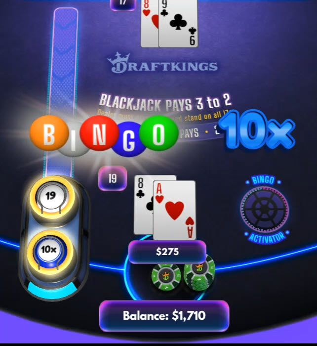 宾果二十一点 (Bingo Blackjack) 是 Draft Kings 推出的一款游戏,如果玩家的点数总数达到牌局开始时随机抽取的 12 到 21 之间的数字,即可获得翻倍赔付。每手牌需额外支付 20% 的费用。