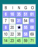 - 游戏使用5x5的宾果卡进行。中间的方格是“自由方格”,已预先标记。其他方格则覆盖着从1到75的24个随机数字。