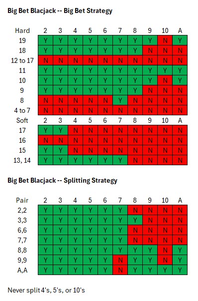 以下策略展示了何时下大注以及何时分牌。否则,请使用常规二十一点策略来决定要牌和停牌。