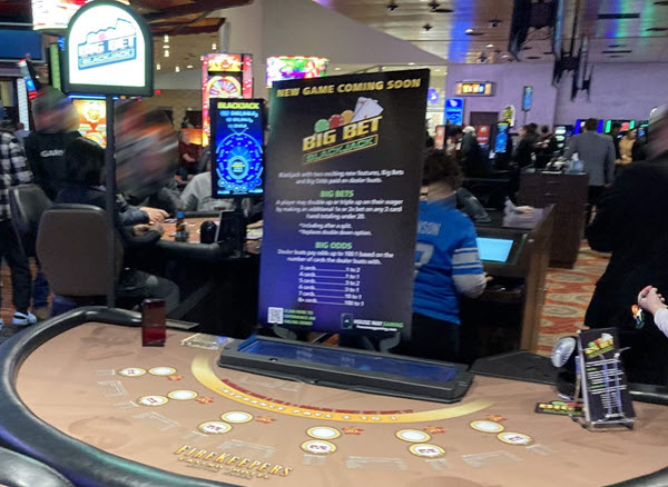 大赌注二十一点 (Big Bet Blackjack) 是二十一点的一种变体,允许玩家在看到牌后追加下注。这款游戏可以在密歇根州巴特尔克里克的Firekeepers 赌场玩。