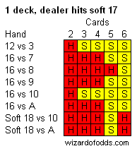 使用普通的全牌依赖型基本策略,在 Boss Media 规则下,玩家优势为 0.11%,而在Microgaming规则下,庄家优势为 0.13%。这些策略可以在我的Boss Media和Microgaming评测中找到。全牌依赖型基本策略是根据玩家手牌总数的最佳玩法。然而,有时,尤其是在单副牌游戏中,根据玩家手中的具体牌型,也会有例外。例如,综合考虑所有因素,如果庄家有 2,停牌比拿 13 要好。但是,如果庄家有 10 和 3,如果庄家有 2,拿 10 和 3 要好。下表是组合依赖型基本策略,这是根据玩家手牌具体组合的最佳玩法。如果是三张或更多牌,策略相同。使用本页上的组合依赖型策略将使庄家优势降低 0.04%,或者具体来说,在 Boss Media 规则下,玩家将获得 0.1541% 的优势。