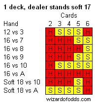 本附录展示了使用单副牌且庄家在软17点停牌时的牌型依赖策略。据我所知,世界上采用此类规则的实体赌场数量为零。在我创建此页面时,您曾经可以在一些互联网赌场找到此类规则。