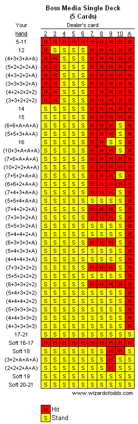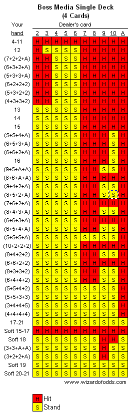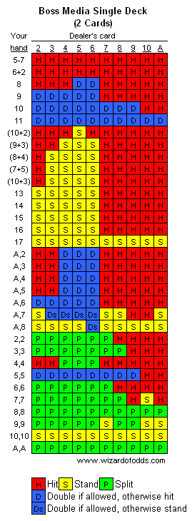 以下表格适用于 Boss Media 规则。它们也适用于 Microgaming 规则,但玩家不应在 11 点或 8 点对 10 点或 A 点时加倍,因为根据 Microgaming Classic Blackjack 规则,庄家不会偷看黑杰克。Microgaming 也不允许在 8 点时加倍。