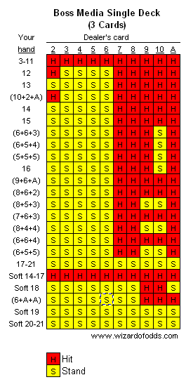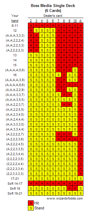 使用普通的全牌依赖型基本策略,在 Boss Media 规则下,玩家优势为 0.11%,而在Microgaming规则下,庄家优势为 0.13%。这些策略可以在我的Boss Media和Microgaming评测中找到。全牌依赖型基本策略是根据玩家手牌总数的最佳玩法。然而,有时,尤其是在单副牌游戏中,根据玩家手中的具体牌型,也会有例外。例如,综合考虑所有因素,如果庄家有 2,停牌比拿 13 要好。但是,如果庄家有 10 和 3,如果庄家有 2,拿 10 和 3 要好。下表是组合依赖型基本策略,这是根据玩家手牌具体组合的最佳玩法。如果是三张或更多牌,策略相同。使用本页上的组合依赖型策略将使庄家优势降低 0.04%,或者具体来说,在 Boss Media 规则下,玩家将获得 0.1541% 的优势。