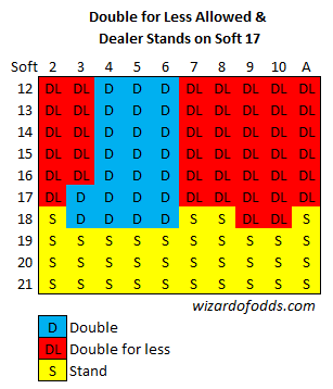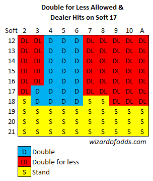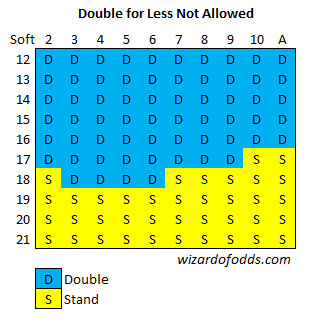 如果允许加倍较少的牌,并且庄家在软 17 点时停牌,则适用下表。