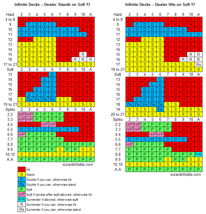无限牌和四副牌之间的唯一区别是,只有当庄家拿到软 17 点时,才能拿到软 13 点对 5 点,以及软 15 点对 4 点。