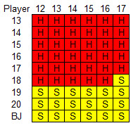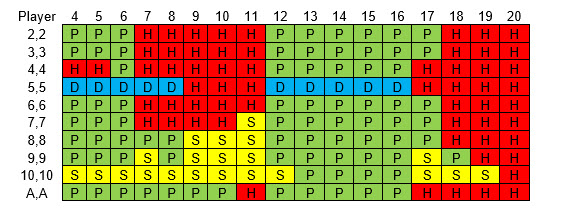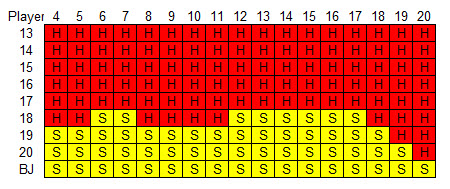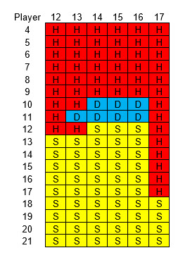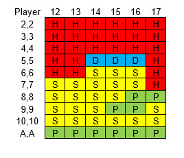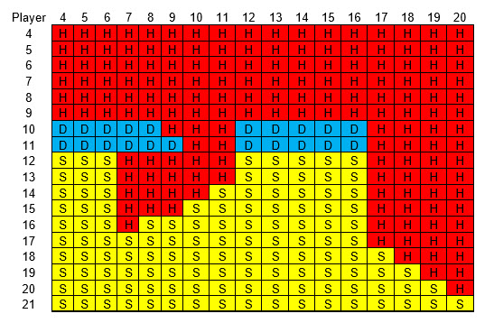 面朝上二十一点的策略相当复杂。玩家持有硬点数、软点数或对子,以及庄家持有硬点数或软点数时,有六种不同的策略,我将在下面逐一介绍。庄家软点数 18 到 20 应视为硬点数。