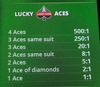 - 幸运Ace的赔率基于玩家和庄家最初两张牌组成的四张牌。赔率表如下。所有奖金均按“一赔一”计算,即赢钱后将返还原始赌注。