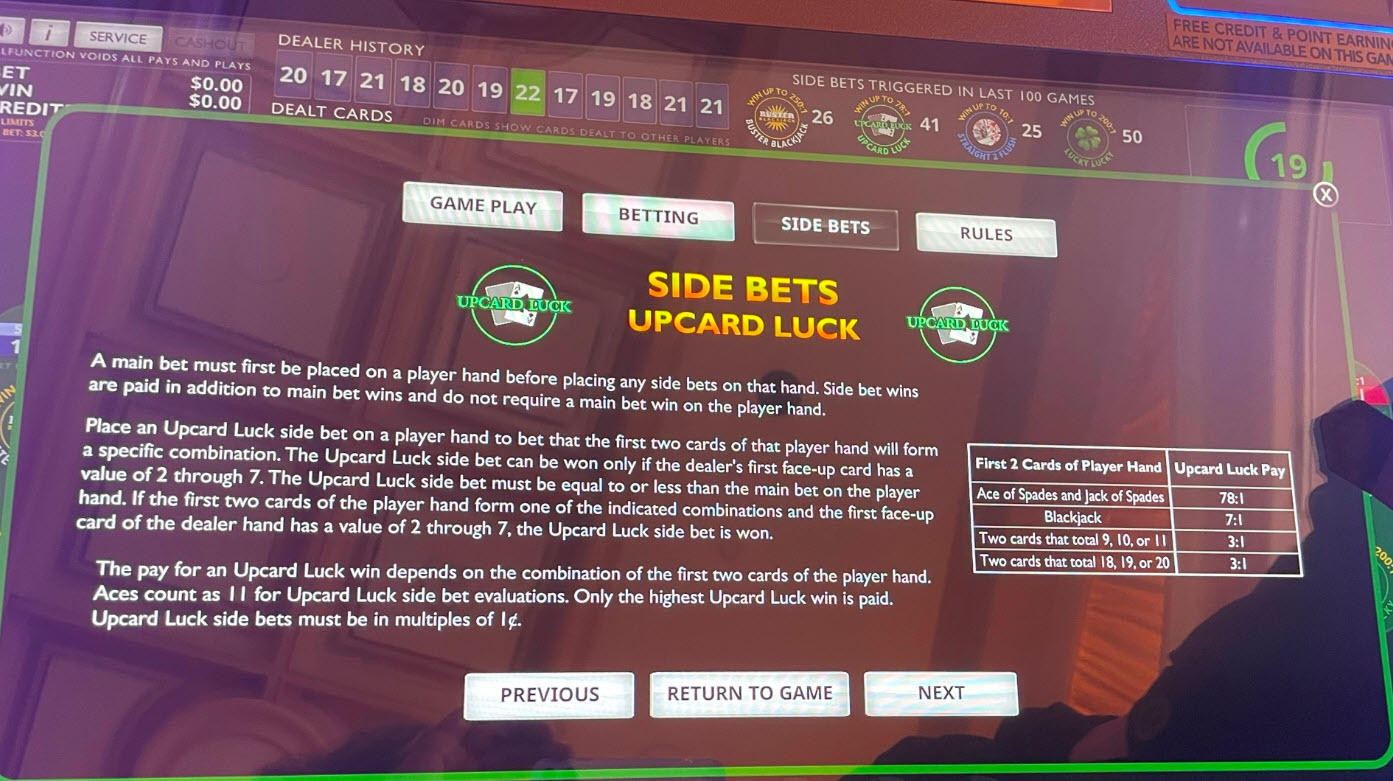 明牌运气 (Upcard Luck) 是 IGT 王朝二十一点游戏中的一种二十一点附加赌注。其前提是,如果玩家在初始牌发完后处于有利位置,则该赌注获胜。要获胜,庄家必须有 2 到 7 的明牌,而玩家有黑杰克或总点数为 9 到 11 或 18 到 20。