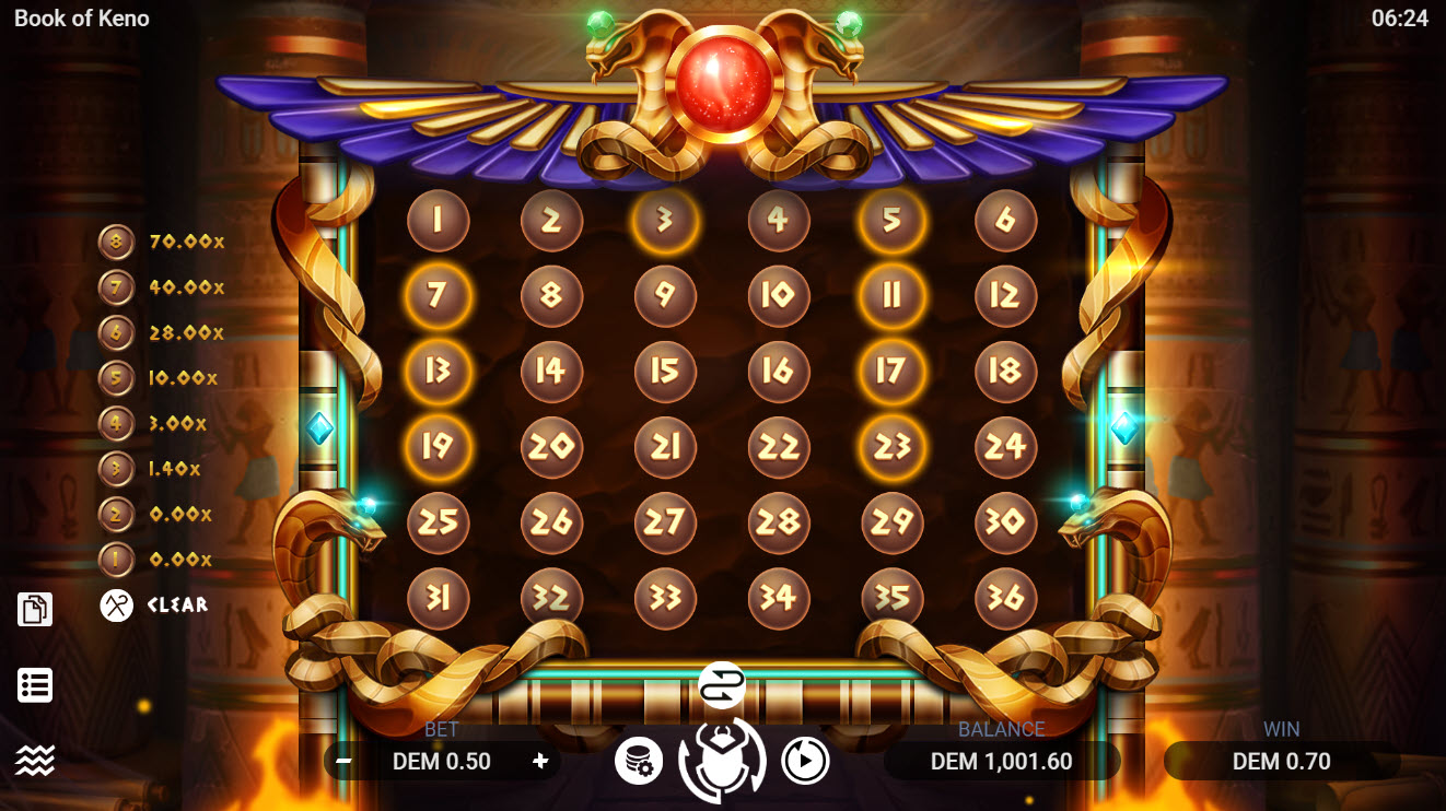 Book of Keno 是Evoplay Entertainment推出的一款基诺游戏,Evoplay Entertainment 是一家为互联网赌场开发游戏的软件公司。它的玩法与普通基诺游戏类似,只是球的数量是 36 个,而不是 80 个。