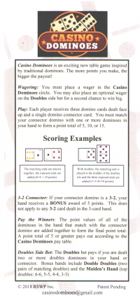 如果不算牌九的话,赌场多米诺骨牌是我见过的第一款用多米诺骨牌玩的赌场游戏。我第一次听说它是在2017年的Cutting Edge桌游展上,当时我和游戏制作人一起制作了这段视频。这款游戏使用印有多米诺骨牌图案的扑克牌进行游戏。它提供两种下注方式,无需任何技巧。它于2018年9月18日在拉斯维加斯广场酒店进行了实地试验。两天后,我去参观了这家游戏。