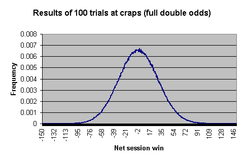 下表显示了100次尝试或最终掷出结果(come out rolls)后预期的净盈亏。为了方便绘制图表,假设玩家在过线(pass line)上投注1美元,并接受双倍赔率。