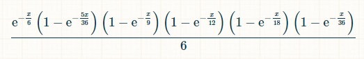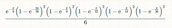 由于中奖数字 7 随时可能出现,中奖概率就是该概率对 x 从 0 到无穷大的积分。我们不需要知道这个值,但在带入积分极限之前,积分等于 (-6*e^(-x/6)+(72*e^(-(7*x)/36))/7+(9*e^(-(2*x)/9))/2-8*e^(-x/4)-(18*e^(-(5*x)/18))/5-(72*e^(-(11*x)/36))/11+(72*e^(-(13*x)/36))/13+(108*e^(-(7*x)/1) 8))/7+(24*e^(-(5*x)/12))/5-(27*e^(-(4*x)/9))/4-(216*e^(-(17*x)/36))/17-10* e^(-x/2)-(72*e^(-(19*x)/36))/19+(27*e^(-(5*x)/9))/5+(144*e^(-(7*x)/12))/7+ (54*e^(-(11*x)/18))/11-(72*e^(-(23*x)/36))/23-(15*e^(-(2*x)/3))/2-(216*e^( -(25*x)/36))/25-(54*e^(-(13*x)/18))/13+(8*e^(-(3*x)/4))/3+(54*e^(-(7*x)/9) )/7+(72*e^(-(29*x)/36))/29-(72*e^(-(31*x)/36))/31-(9*e^(-(8*x)/9))/8-(24*e ^(-(11*x)/12))/11+(18*e^(-(17*x)/18))/17+(72*e^(-(35*x)/36))/35-e^(-x))/6。