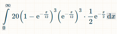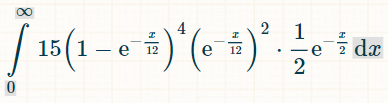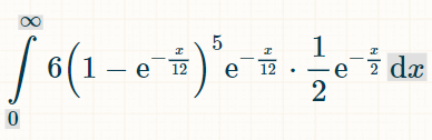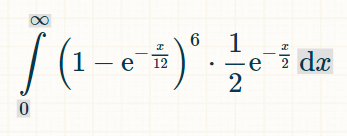 要计算积分,我推荐使用这个积分计算器。在积分栏中输入“(1-exp(-x/12))^6*(1/2)*exp(-x/2)”。对于积分极限,在选项下输入 0 和 ∞。然后点击“开始”。“它将给出下面的积分: