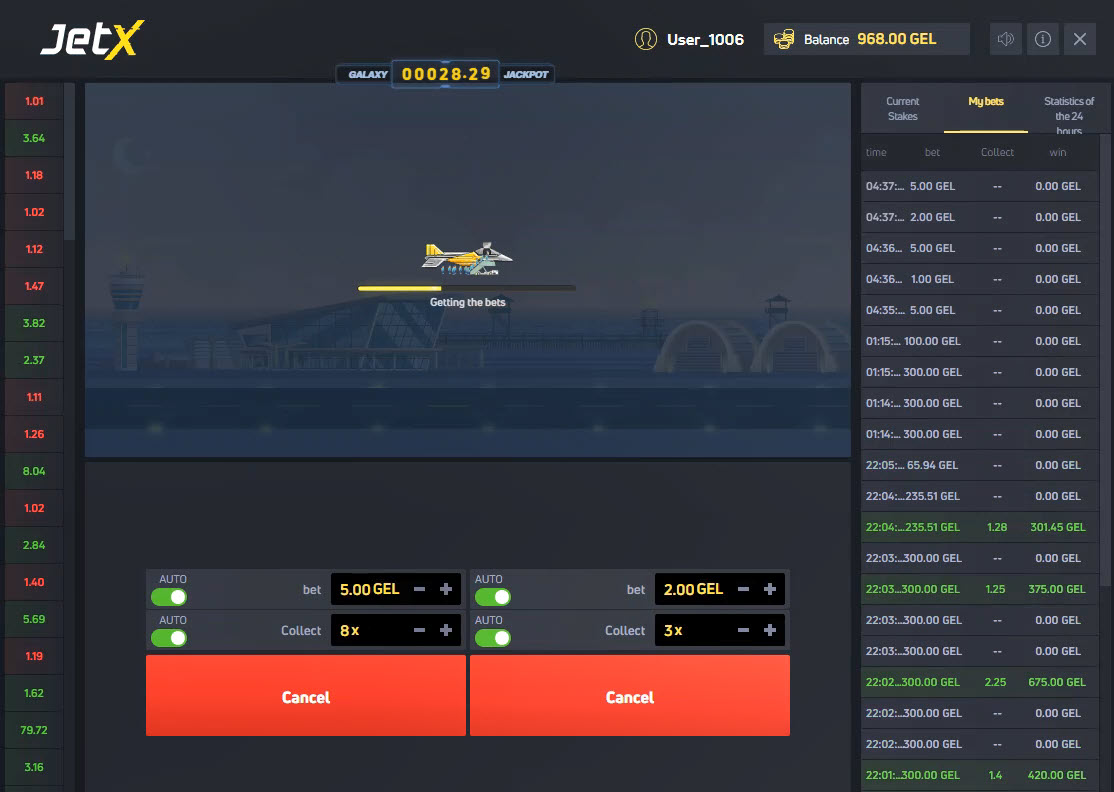 在进行一对投注之前,我的余额是 975 GEL。说实话,我根本不知道 GEL 是什么。游戏是在娱乐模式下进行的。我进行了两次投注,如上图所示。左下角的方框中显示的是第一个投注,投注金额为 5,目标是赢得我投注金额的 8 倍,也就是 40。右下角的方框中显示的是第二个投注,投注金额为 2,目标是赢得我投注金额的 3 倍,也就是 6。确认这些投注后,也就是截取此屏幕截图之前,我的余额减少了 7,降至 968,您可以在顶部的余额字段中看到。