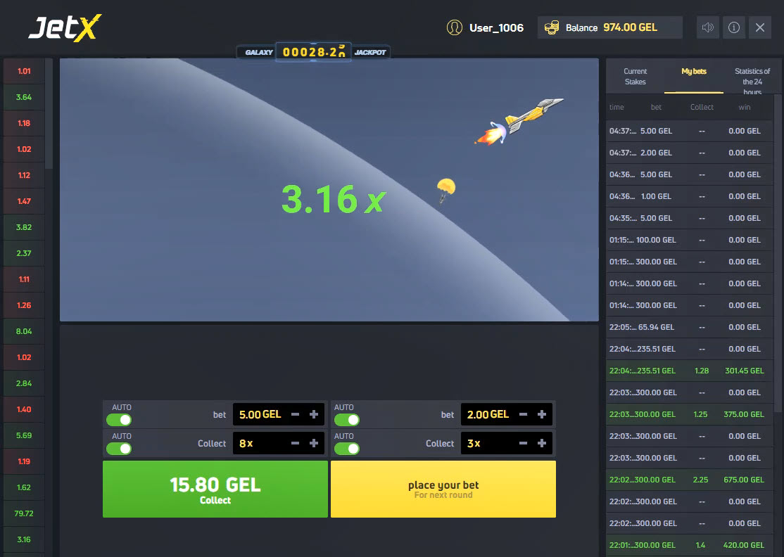 更令人困惑的是,玩家可以在同一游戏中对不同的乘数进行一到两次投注。如果玩家这样做,那么飞船上将有两名飞行员,根据玩家选择从不同的高度弹射出去。
