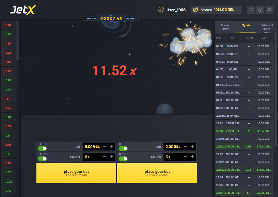 这其实并不重要,但宇宙飞船会一直上升直到爆炸,这次爆炸的倍数是11.52倍。另外请注意我的余额是1014格鲁吉亚拉里。提醒一下,下注后我的余额是968格鲁吉亚拉里。左侧投注的回报是5×8=40。右侧投注的回报是2×3=6。我的总奖金是40+6=46。因此,我的新余额是968+46=1014。