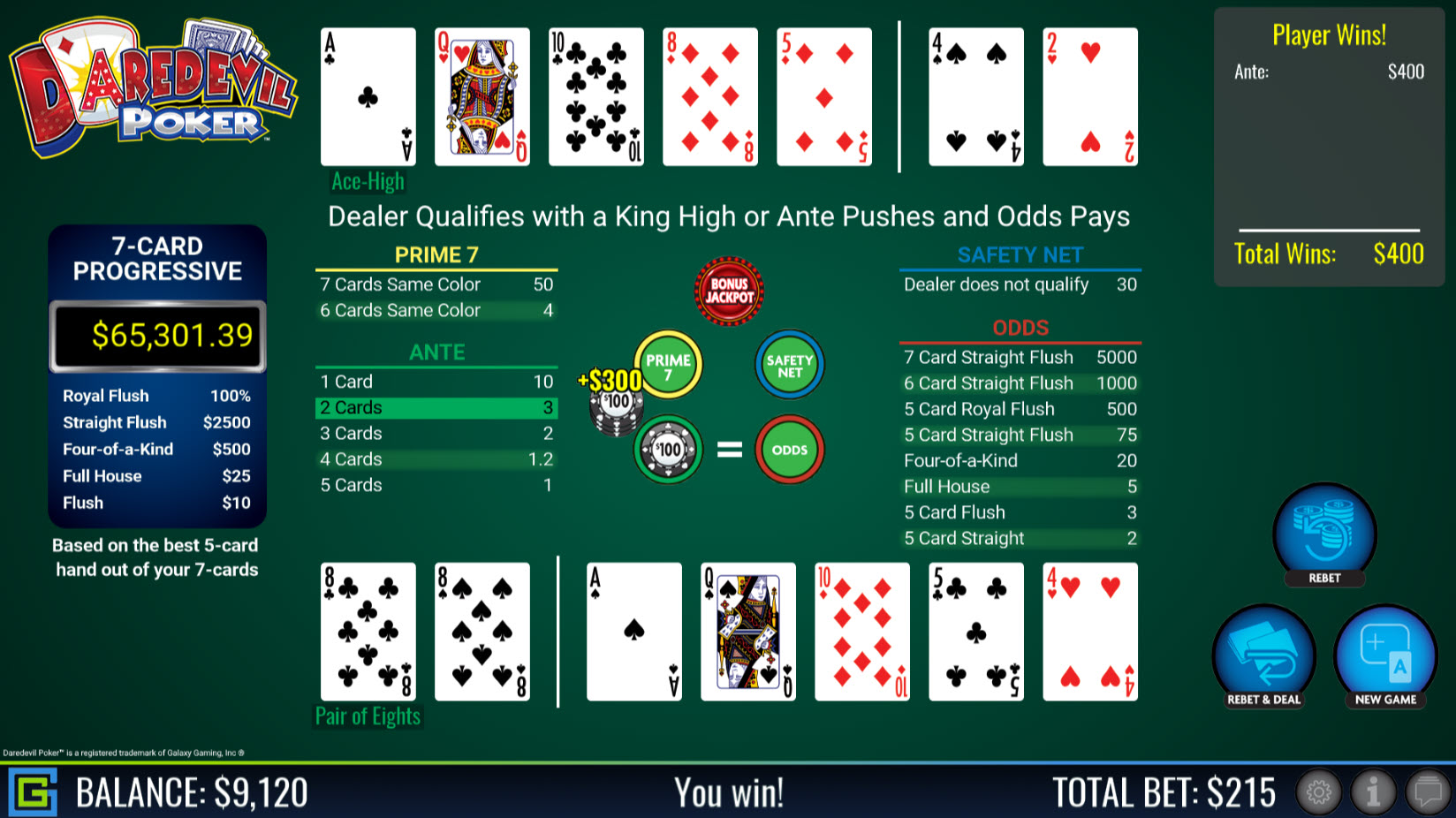 下图中,我在 Ante 和 Odds 上各下注 100 美元。我还在 Prime 7、Safety Net 和 Bonus Jackpot 上各下注 5 美元。我选择只持有对 8。