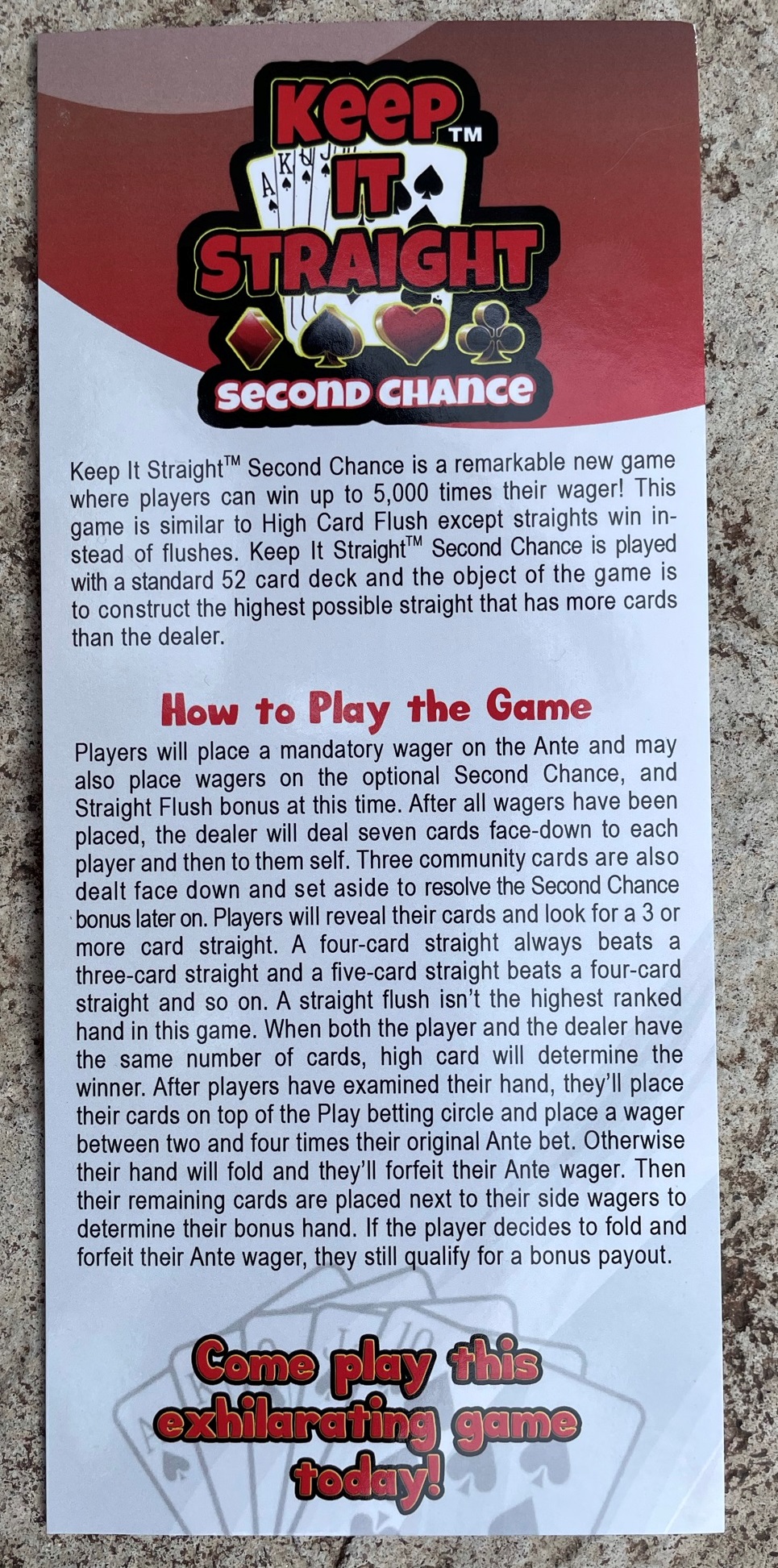 保持顺子“第二次机会”是 Creative Dream Gaming, LLC 推出的一款扑克变体游戏。它很容易与“高牌同花”进行比较,不同之处在于目标是获得比庄家更长的顺子。我第一次看到这款游戏是在 2021 年 11 月 16 日,当时它在拉斯维加斯火烈鸟酒店进行现场测试。