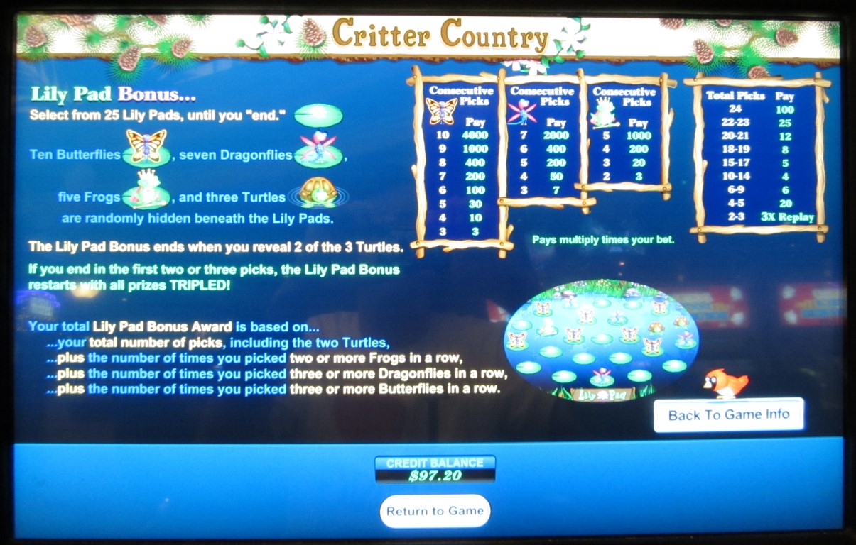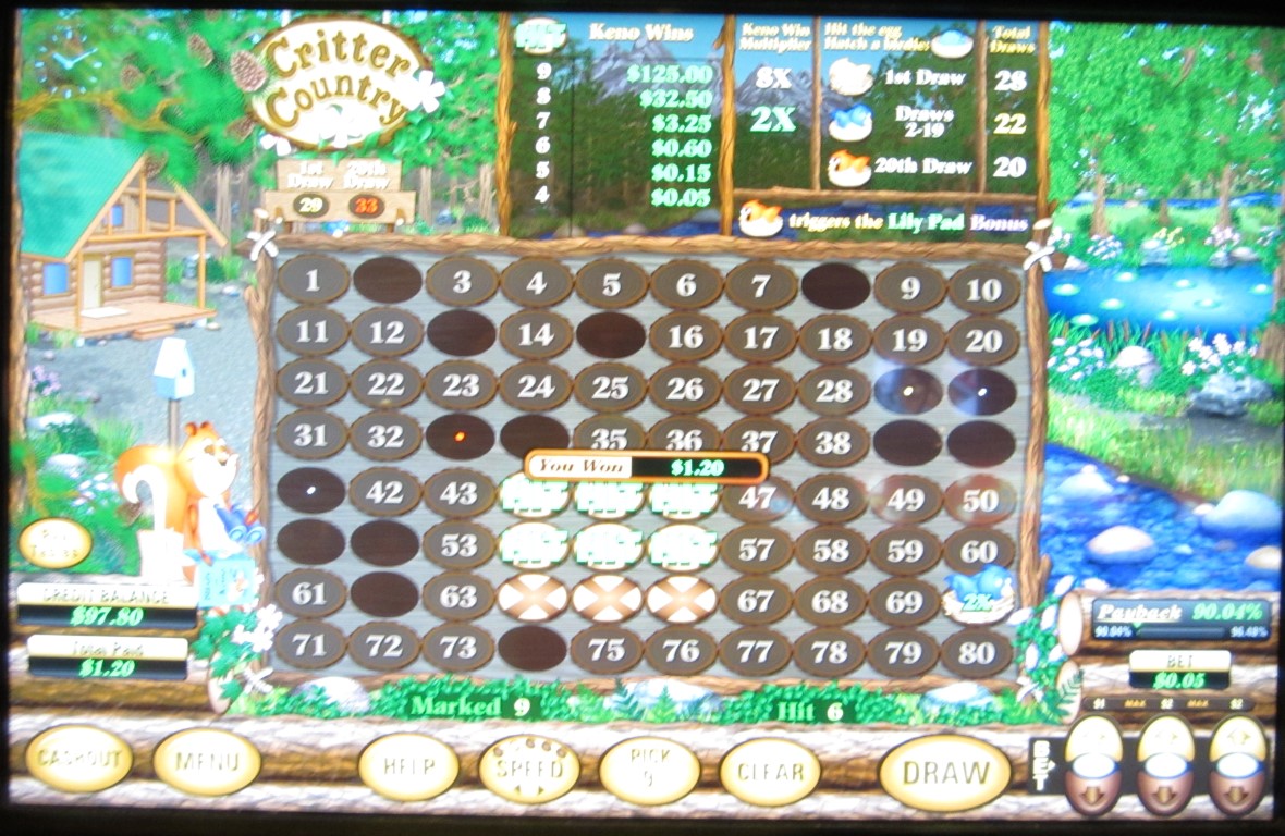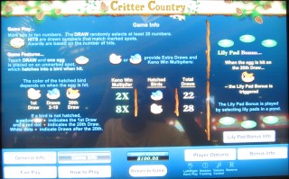 Critter Country 是一款基于基诺的游戏,可以在 U1 Gaming 生产的多游戏机上使用。我在拉斯维加斯的拉斯维加斯俱乐部、Rampart 和 Dotty's 赌场都见过这样的机器。Critter Country 的特色是游戏会随机选择一个未选中的数字来放置一个彩蛋。如果其中一个随机抽取的数字击中彩蛋,玩家就可以赢得倍数、额外的彩球或奖励回合。