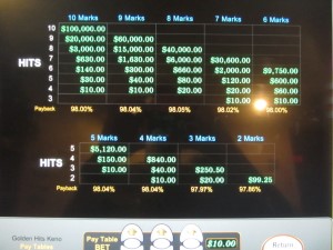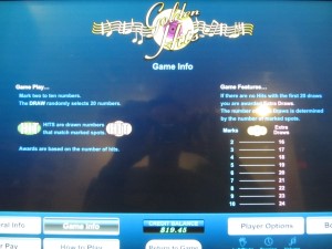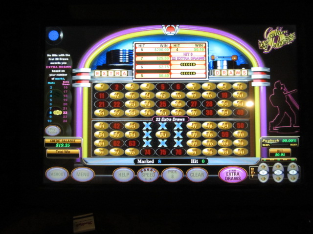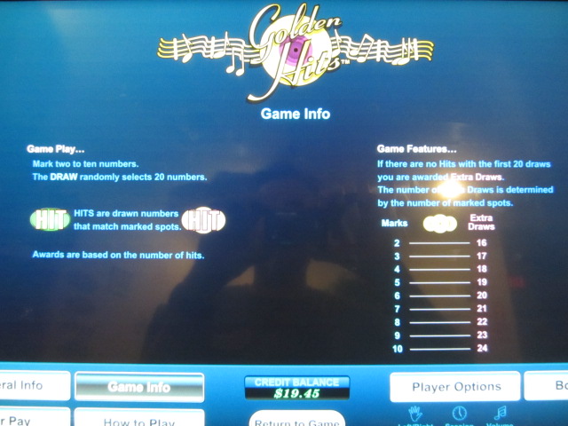 Golden Hits 是一款基于基诺的游戏,可以在U1 Gaming生产的多游戏机上使用。我在拉斯维加斯的拉斯维加斯俱乐部、Rampart、El Cortez 和 Dotty's 赌场都见过这样的机器。Golden Hits 的重点是,如果玩家没有击中任何球,游戏会根据玩家击中的球数,再选择 16-24 个球。
