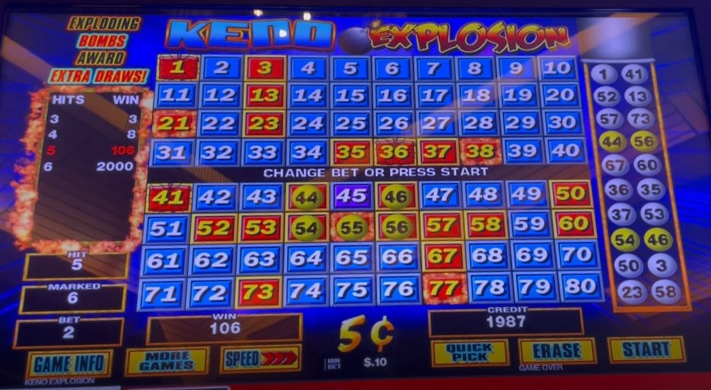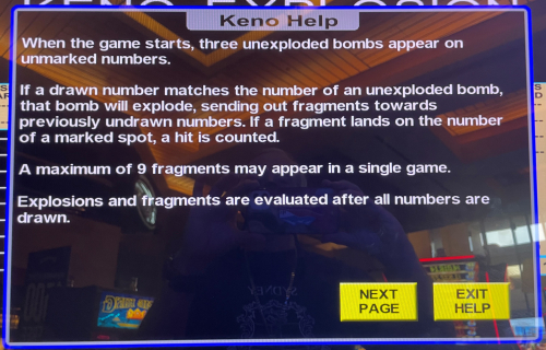 基诺爆炸 (Keno Explosion) 是 IGT 推出的一款基诺游戏。玩家需要将炸弹放在三个未选的数字上。如果抽出的球与炸弹对应的数字匹配,炸弹就会爆炸;如果炸弹碎片击中玩家选择的数字,则算中奖。