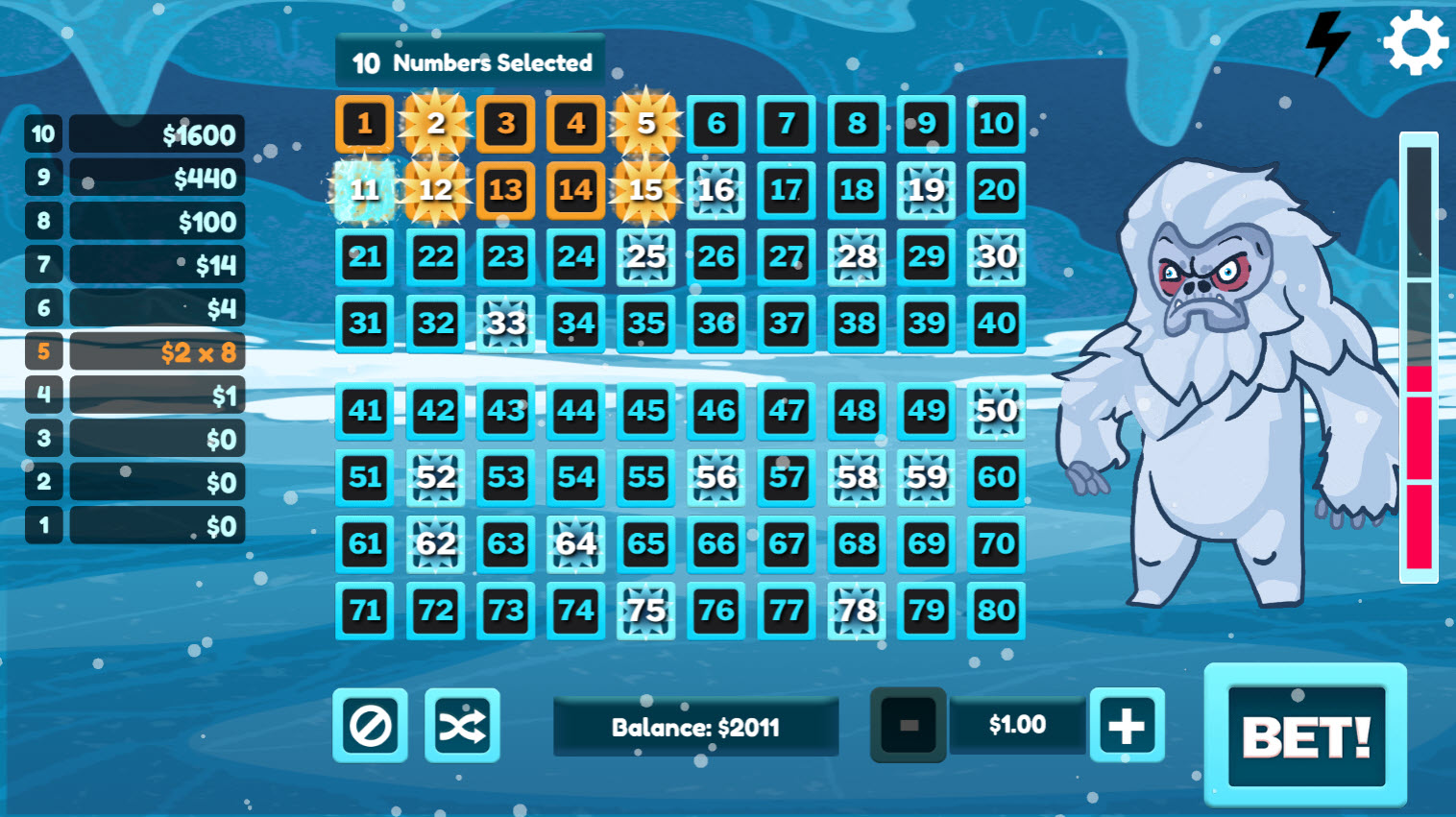 Mad Yeti Keno 的规则与常规基诺相同,但如果玩家接住了第 20 个球,则任何奖金都会乘以 8。换句话说,它与Power Keno相同,只是如果最后一个球被接住了,奖金会乘以 8 而不是 4。