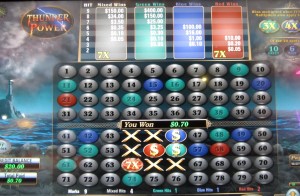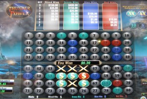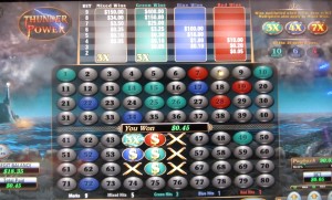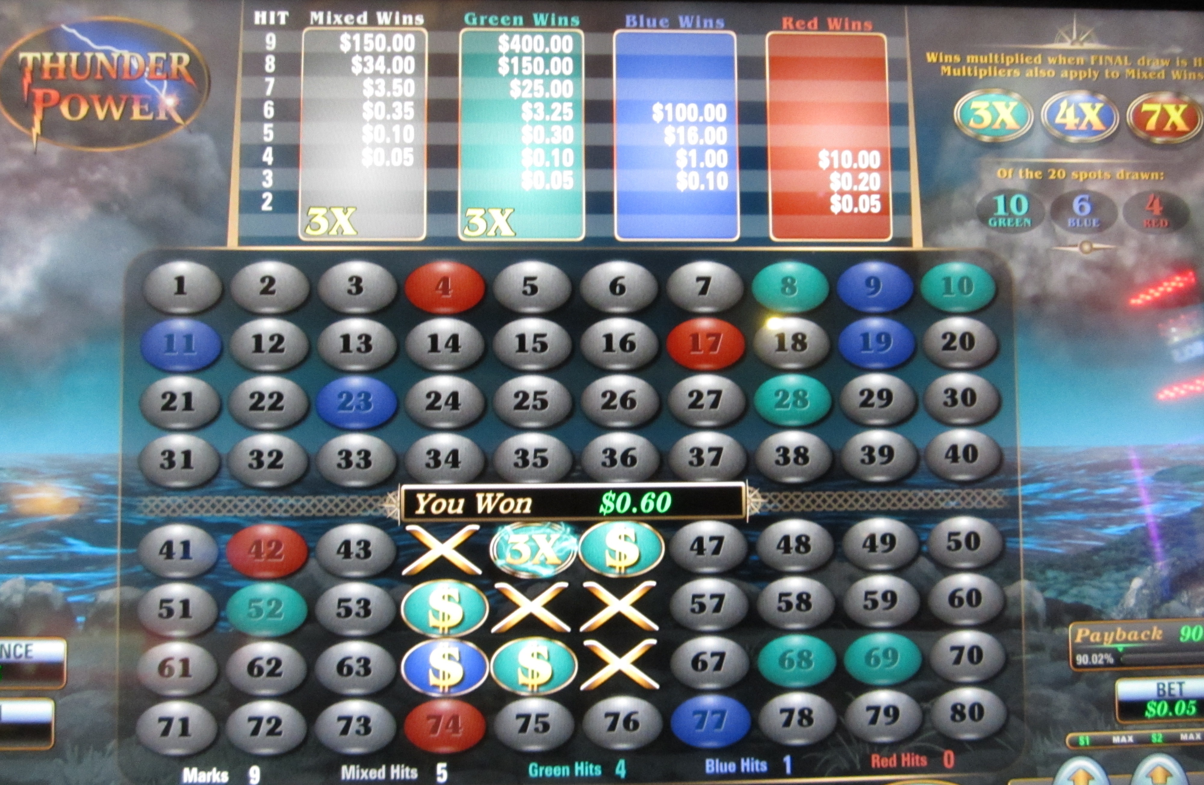 Thunder Power 是一款基于基诺的游戏,可以在U1 Gaming生产的多游戏机上使用。我在拉斯维加斯的拉斯维加斯俱乐部、Rampart、El Cortez 和 Dotty's 赌场都见过这样的机器。Thunder Power 的特色是抽取不同颜色的球,根据抽取每种颜色球的数量和颜色的混合程度,有四种不同的获胜方式。
