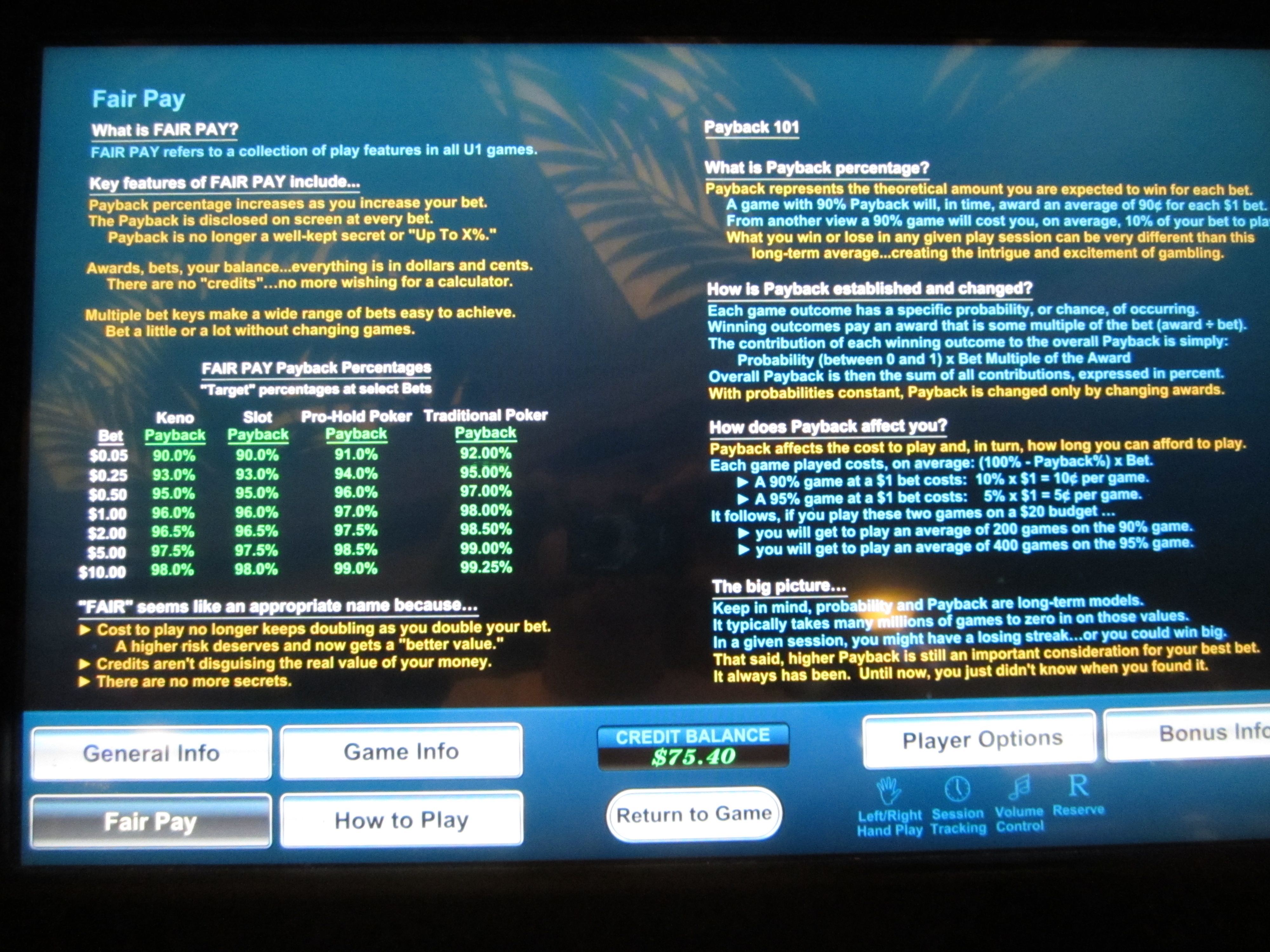 U1 Gaming 生产的多游戏机提供种类繁多的视频扑克、基诺和老虎机游戏。视频扑克游戏分为两种类型:“专业扑克”和常规“扑克”。在“专业扑克”游戏中,游戏具有基于最佳策略的自动暂停功能。在常规“扑克”游戏中,没有自动暂停功能,因此玩家在策略方面需要自行决定。U1 与其他老虎机制造商的不同之处在于,他们公开声明所有游戏的理论回报率。随着玩家下注的增加,赔付表会变得更加丰厚,预期回报率也会随之增加。