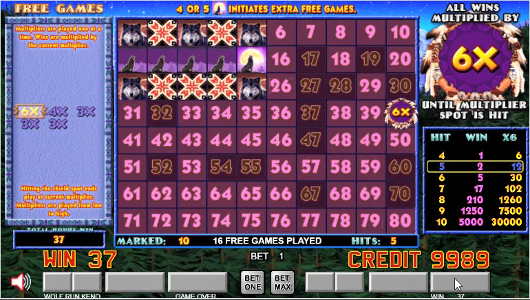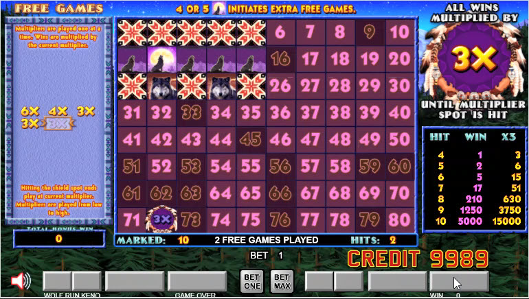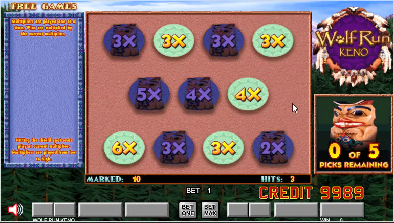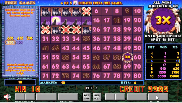 上图显示我选择保持我的选择不变。我的十个标记点标有X。五个奖励点标有狼。您还可以在左侧面板中看到我的乘数。其中一个3倍乘数已突出显示,它将应用于下一局游戏。