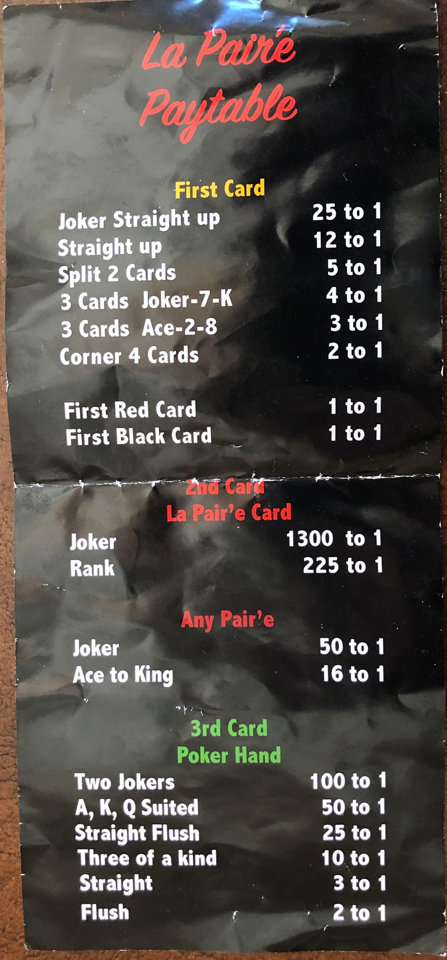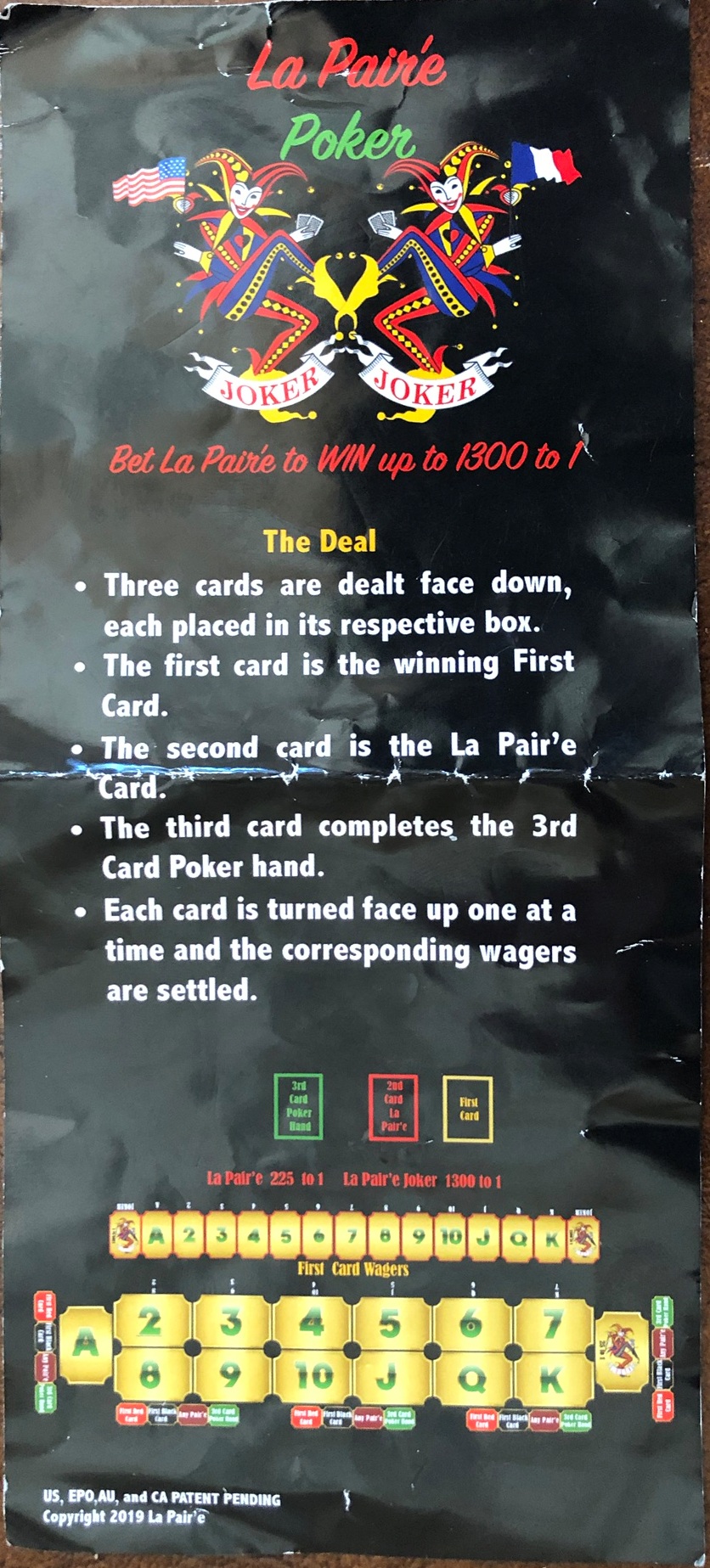 La Pair'e 于 2019 年 9 月 19 日在埃尔科尔特斯酒店 (El Cortez) 开始了内华达州的实地试验。这款游戏很难用简短的语言描述,但如果硬要描述的话,它就像轮盘赌和三张牌扑克的结合体。游戏名称在法语中意为“一对”。