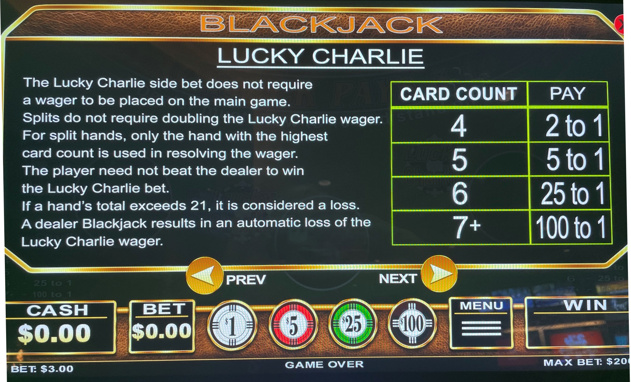 在名为“赌场巫师”的电子二十一点游戏中,“幸运查理”是作为二十一点的附加赌注出现的。然而,我更倾向于将其视为一款独立的游戏,因为它无需下注二十一点即可玩,而且策略性很强。同时玩“幸运查理”和二十一点可不是个好主意,因为它们的策略截然不同。