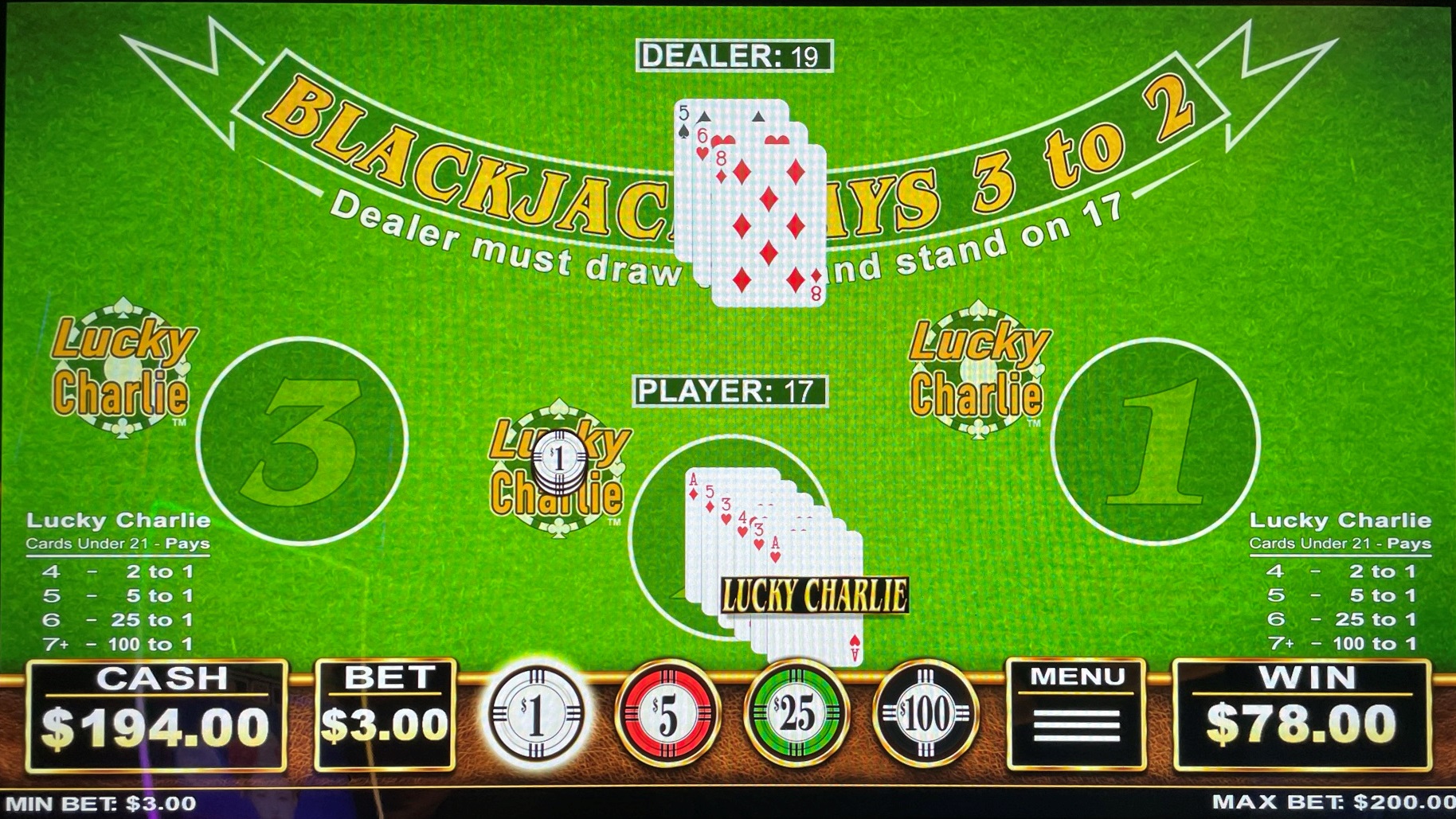- 如果玩家或庄家有黑杰克,则玩家不得抽牌,并且 Lucky Charlie 赌注将会失败。