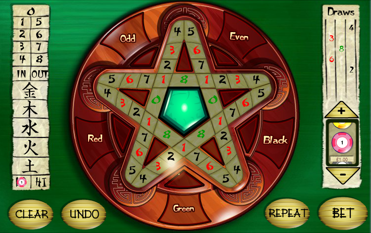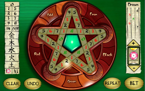 - 金、木、水、火、土:这是五种中国符号。每个符号占据五角星的一条线。记住,其中两个点位于交叉点上,因此权重加倍。因此,每个点的总中奖次数为 2×2 + 7 = 11。
