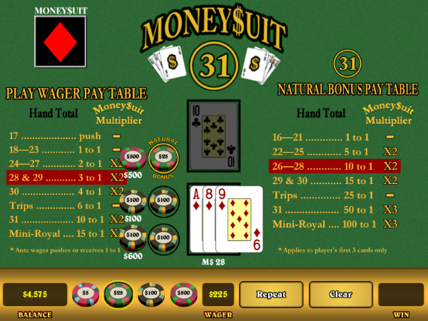 在上面这手牌中,我在底注(Ante)上押了100美元,在“Natural 31”上押了25美元。我的初始三张牌分别是A、8和方块9。幸运的是,Money$uit也是方块。这手牌本来就是28点的赔付牌,所以我又在“Play”上押了100美元。抽牌是梅花10,但这并没有起到什么作用。