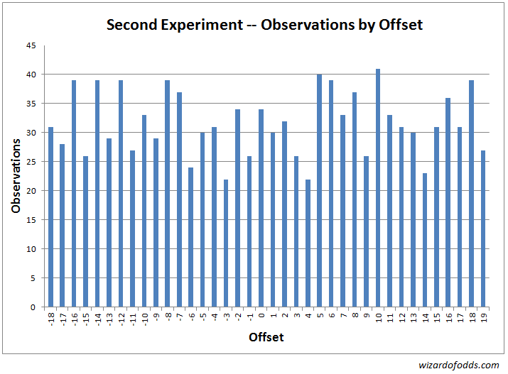 第一次实验和第二次实验结果之间的相关系数为 0.153853。简单来说,这意味着存在轻微的相关性,但完全在两组随机数据的预期范围内。
