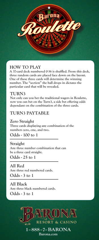 Turn3 是轮盘赌中的一种附加投注。据我所知,唯一一个位于加州巴罗纳赌场的附加投注,除了滚球之外,还必须使用其他方法来确定结果。大多数赌场都使用纸牌。Turn3 的结果取决于代表标准轮盘赌获胜结果的纸牌,以及另外两张纸牌。